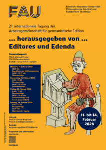 Die einundzwanzigste internationale Tagung der Arbeitsgemeinschaft für germanistische Edition findet vom 11. bis 14. Februar 2026 an der Friedrich-Alexander-Universität Erlangen-Nürnberg statt.